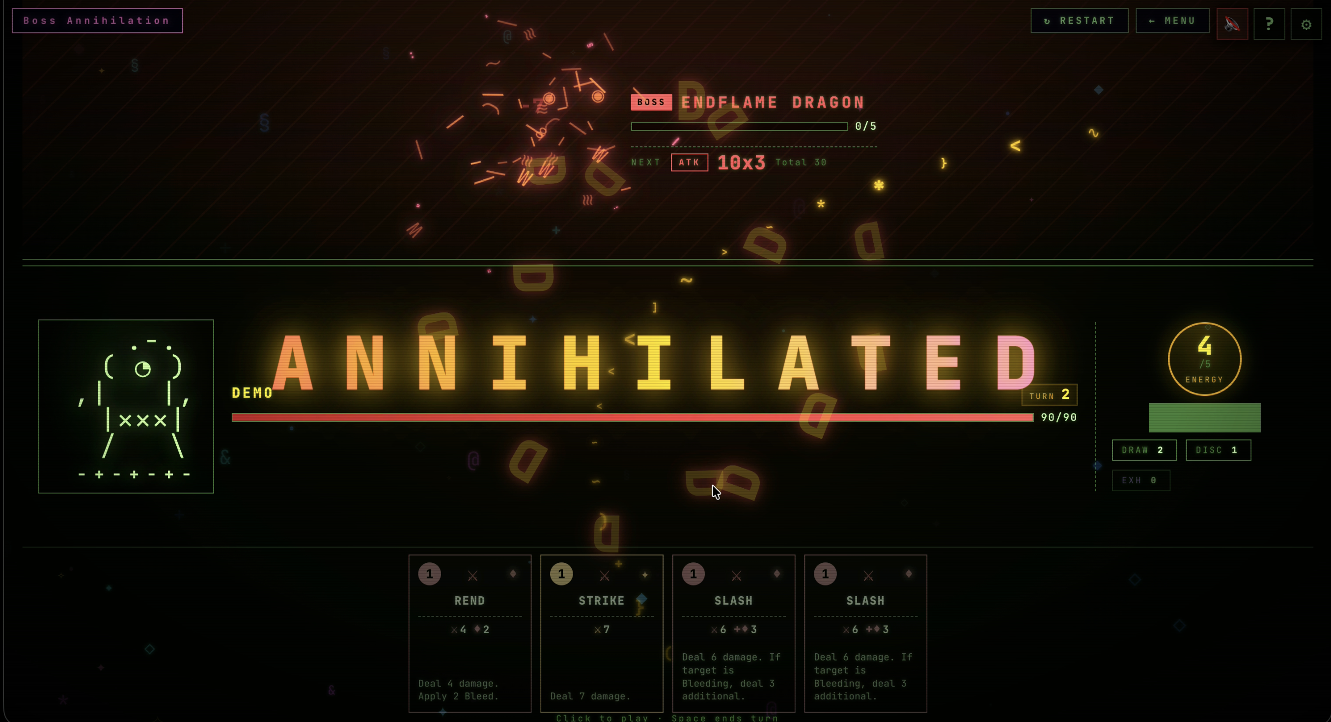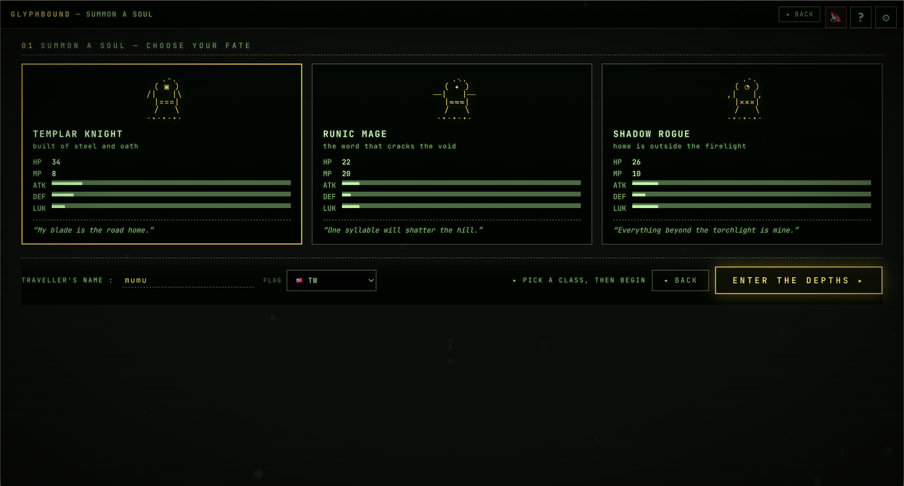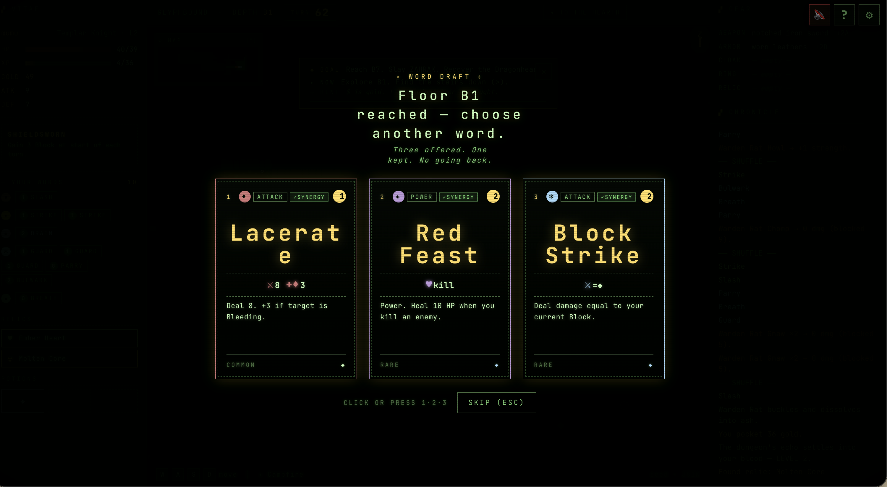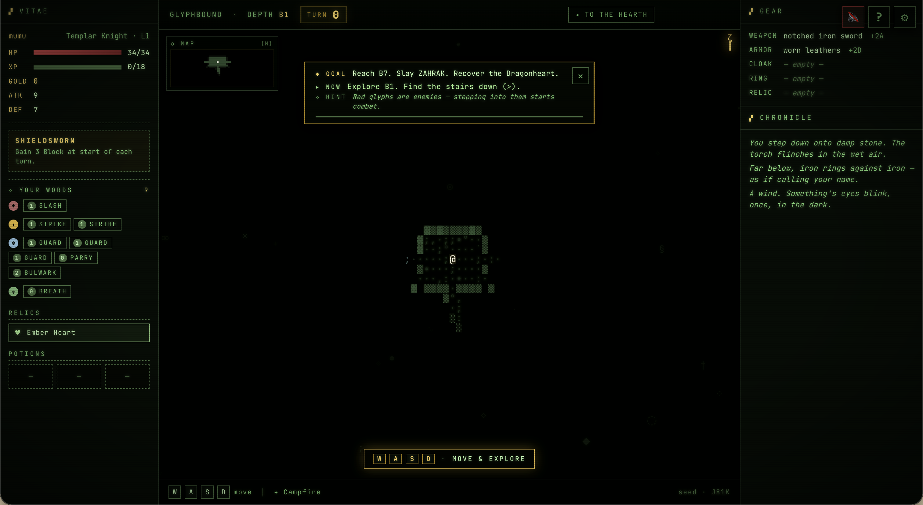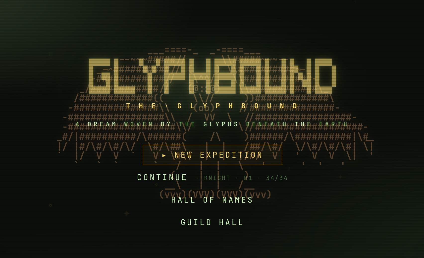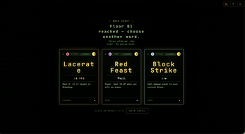 GLYPHBOUND is a browser ASCII roguelike crossed with Slay-the-Spire style deckbuilding combat. No download, no signup — just hit Play.